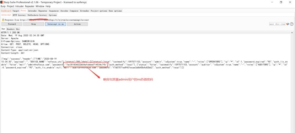 对响应包进行修改,将false更改为true的时候可以泄露管理用户的md5值密码