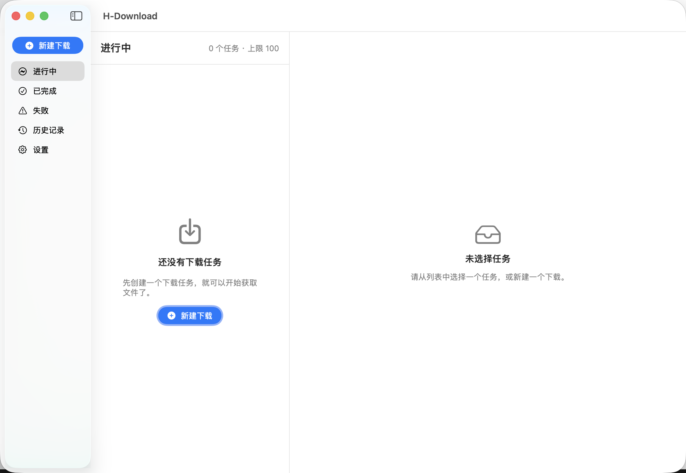 - 当任务列表为空时,列表区域会显示空状态引导和新建下载入口